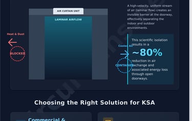 The definitive 2026 guide to air curtains in Saudi Arabia. Learn how to reduce HVAC costs, block dust & pests, and ensure SASO compliance for your facility.