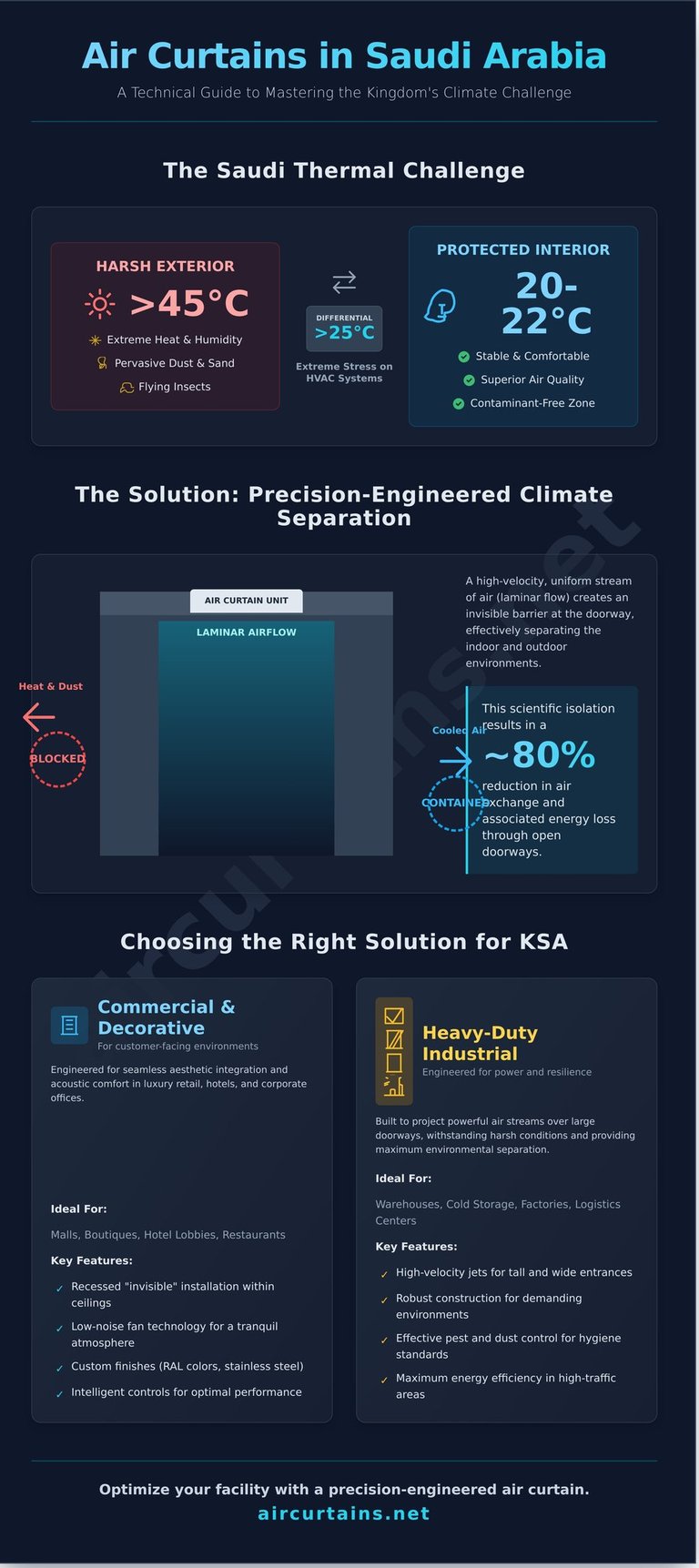 A fundamental misconception in climate control is that air curtains are a "one-size-fits-all" solution. In reality, the effectiveness of an air curtain is a direct result of precise engineering and specification, tailored to the unique environmental and architectural demands of a facility. This is especially true within the Kingdom, where climatic conditions vary dramatically and demand a bespoke approach to achieve genuine climate separation and energy efficiency.